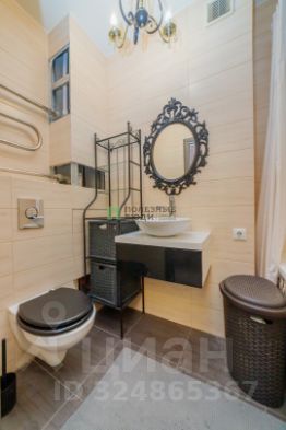 Большое зеркало, раковина-чаша, ванна, удобные места хранения.