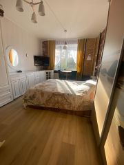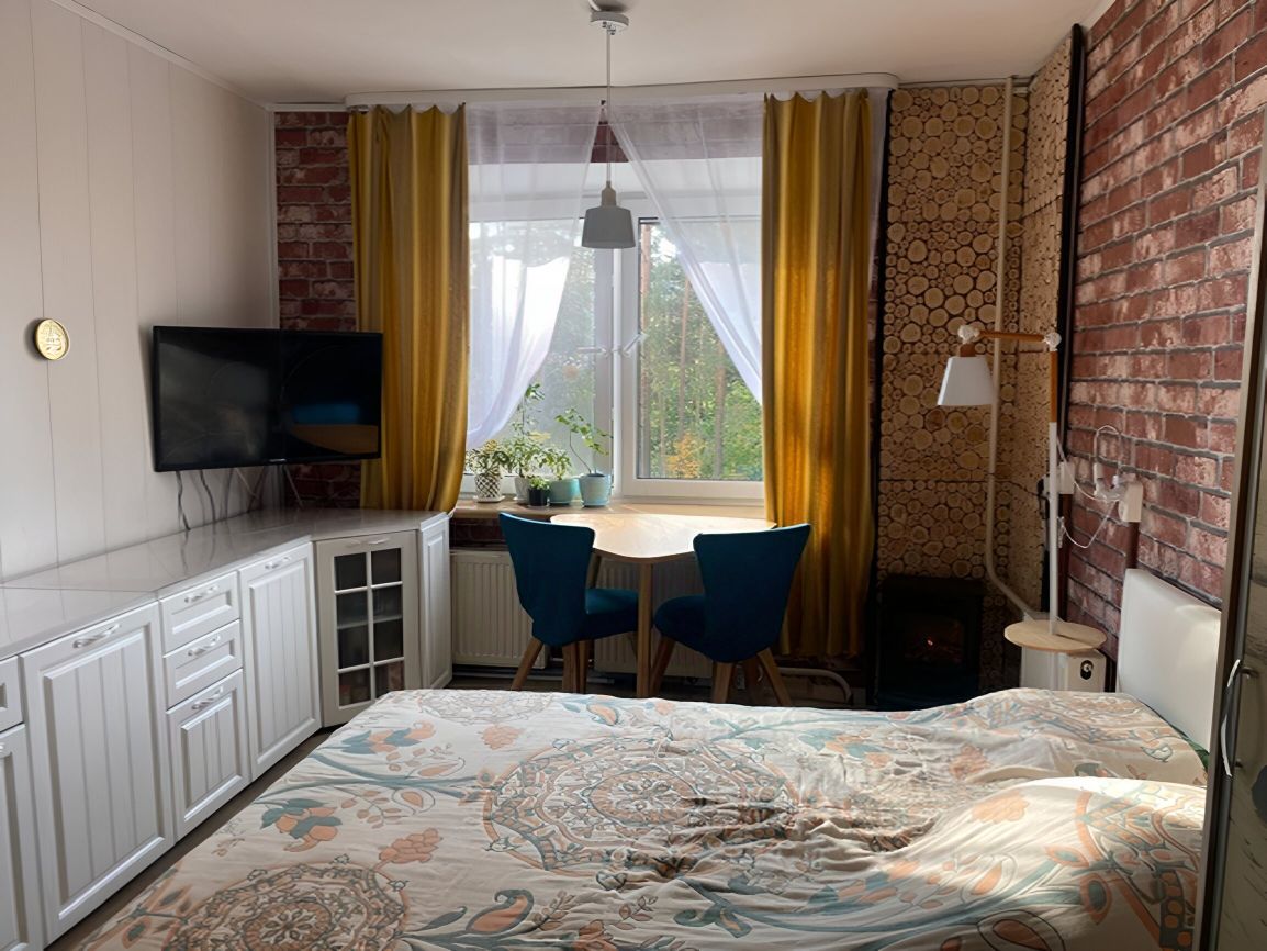 Вид из окна на сосны и зеленую лужайку, тишина и свежий воздух, окно на запад-в сторону моря. Студия общей площадью 18 м. Кв. Находится на комфортном 2 этаже кирпичного пятиэтажного дома. В комнате сделан ремонт. Кухня оборудована электроплитой с духовкой, вытяжкой, мойкой и фильтром для питьевой воды. В кухне предусмотрены отделения для установки холодильника и посудомоечной машины. Студия имеет все необходимое санитарно-гигиеническое оборудование.