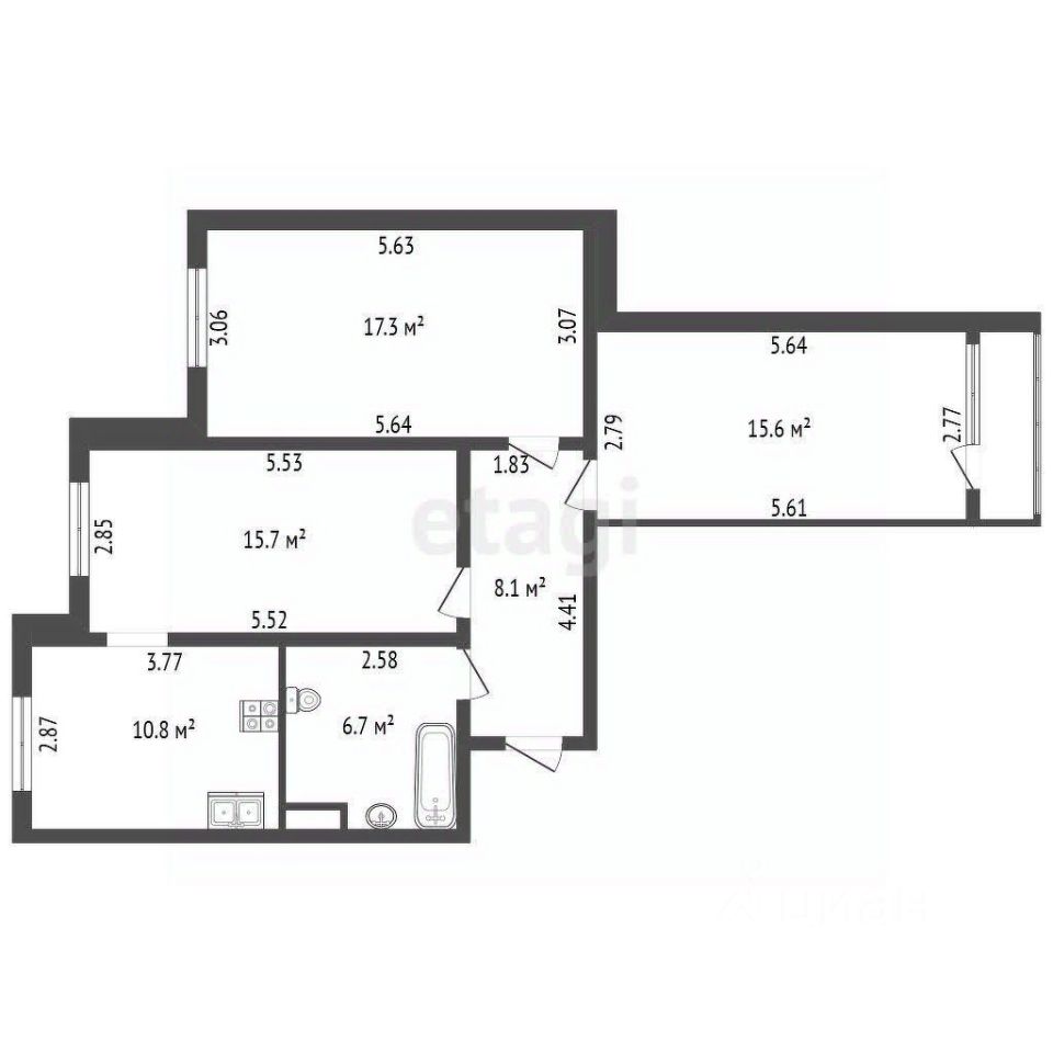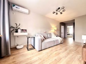 Трехкомнатная квартира площадью 74.2 кв. м в доме 2001 года постройки имеет рациональную планировку и ориентацию окон на две стороны, обеспечивающую равномерное естественное освещение в течение всего дня и эффективный воздухообмен. Жилое пространство грамотно распределено между тремя комнатами площадью 15.7, 17.3 и 15.6 кв. м, одна из которых имеет выход на балкон. Просторная кухня в 10.8 кв. м служит функциональным помещением для повседневного использования и приема гостей, а совмещенный санузел оснащен современной сантехникой.