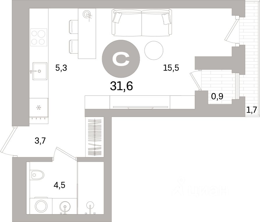 1-комн. квартира-студия с предчистовой отделкой в ЖК "Северный ветер" на 2 этаже. Общая площадь: 31.64 кв.м., площадь гостиной 20.8 кв.м., из которых 5.3 кв.м. выделено под кухонную зону. Все окна выходят на одну сторону. В квартире одна лоджия, один совмещенный санузел. Высота потолков 3.1 м.