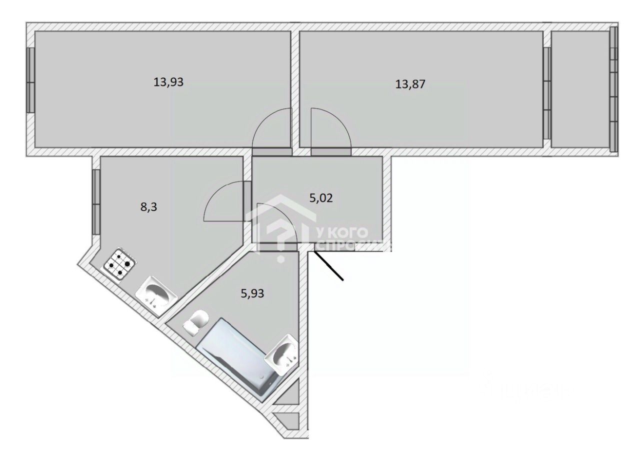 Общая площадь 47,3 кв. м включает в себя две изолированные комнаты (13,93 кв. м и 13,87 кв. м), кухню 8,3 кв. м и совмещённый санузел.