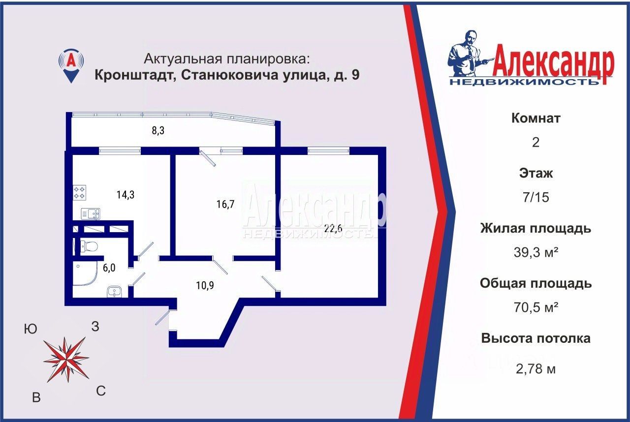1705296 Предлагаем купить просторную видовую 2-х комнатную квартиру 70,5 м² в Кронштадте с большой утепленной лоджией 8,3 м² (не входит в общую площадь квартиры) с панорамным остеклением, с которой можно наблюдать прекрасные вечерние закаты.