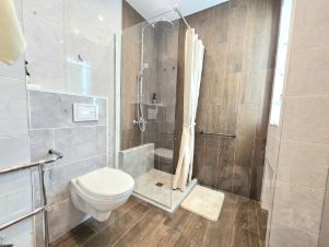 Выполнен по современному дизайну в светлых оттенках, на полу ламинат, в ванной кафельная плитка.