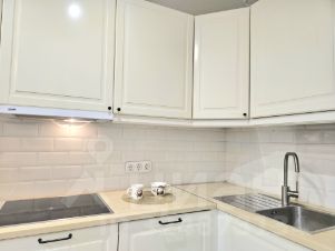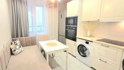 В кухне установлен вместительный кухонный гарнитур со всей необходимой техникой, которая останется покупателю: посудомоечная машина, варочная поверхность, духовой шкаф, холодильник, вытяжка, стиральная машина, а также в квартире остаются 2 шкафа для одежды, тахта и тумба под ТВ.