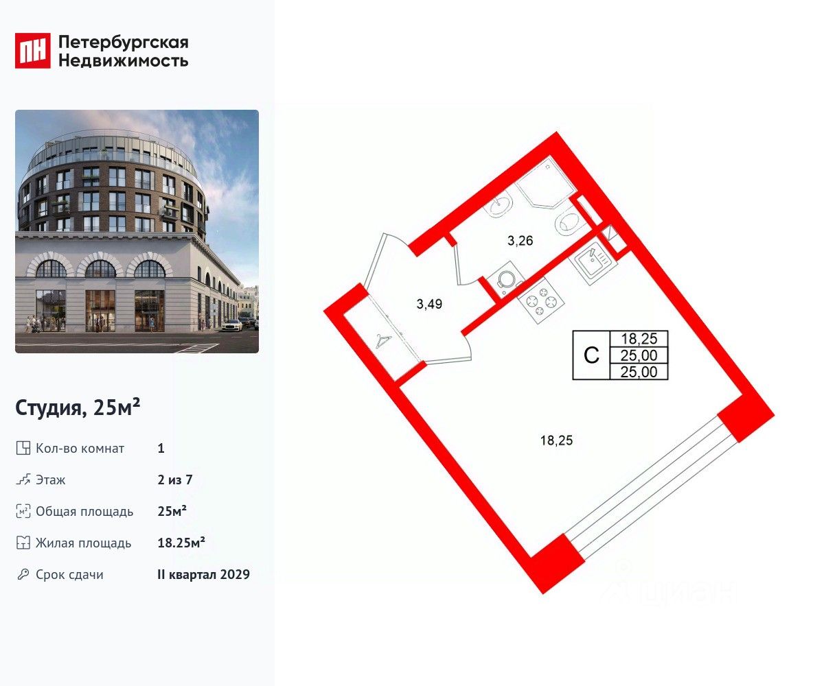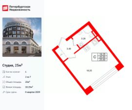 Удобная, классическая, функциональная европланировка, просторная прихожая 3.49 м². Общая площадь студии - 25 м², жилая 18.25 м², высота потолка 3.33 м.