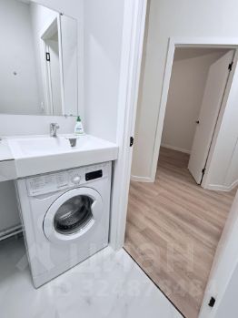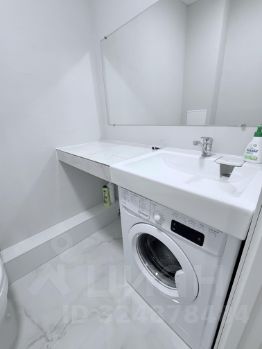 Современная планировка санузла: Практичное и редкое для этого метража решение — полностью изолированный душ в одном помещении и отдельный туалет с просторной столешницей под раковину и специально выделенным местом под стиральную машину.