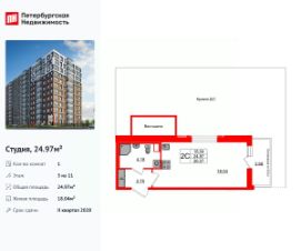 Удобная, классическая, функциональная европланировка, вместительная прихожая 2.75 м². Общая площадь студии - 24.97 м², жилая 18.04 м², высота потолка 2.77 м.