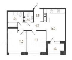 Общая площадь 55,6 м2 шикарная кухня 16,2 м2 и комнаты 11,1 и 11 м2, два санузла 5,4 и 2,5 м2 и лоджия 3,6 м2.