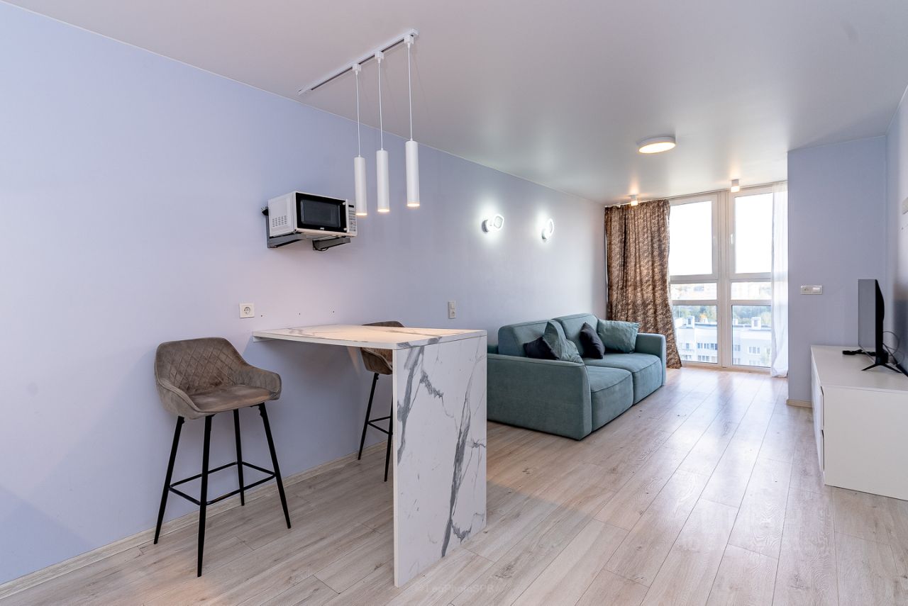 Современный ЖК бизнес класса Репка ( До Ре Ми ) 2016 года постройки с закрытой охраняемой территорией от известного застройщика Прагма. Вокруг ЖК все утопает в зелени. Коломяги известны своей природой. Дом Кирпич-монолит. Квартира находится на 11-м этаже, с которого открывается потрясающий вид на Петербург и его окрестности. В квартире сделан дизайнерский ремонт на полу ламинат , в санузле плитка и теплый пол. В квартире очень хорошая функциональная планировка: большая и просторная жилая зона с кухней 23,6 кв.м., есть место или под кабинет или под гардеробную, совмещенный санузел. В комнате панорамные окна от пола до потолка. Все фото соответствуют реальности. БОЛЬШАЯ ЧАСТЬ МЕБЕЛИ И ТЕХНИКИ ОСТАНЕТСЯ ПОКУПАТЕЛЮ!!!!!!