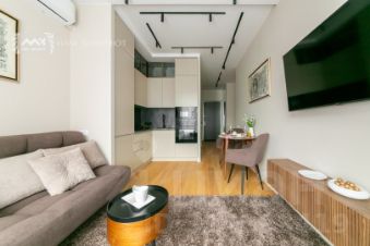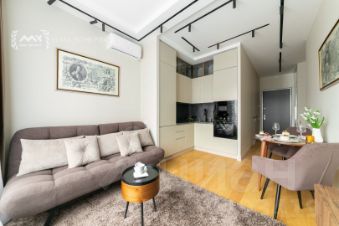Выполнен дизайнерский ремонт с использованием материалов высокого качества. Продуманная комбинация освещения, теплые полы, умные карнизы, видеодомофон.