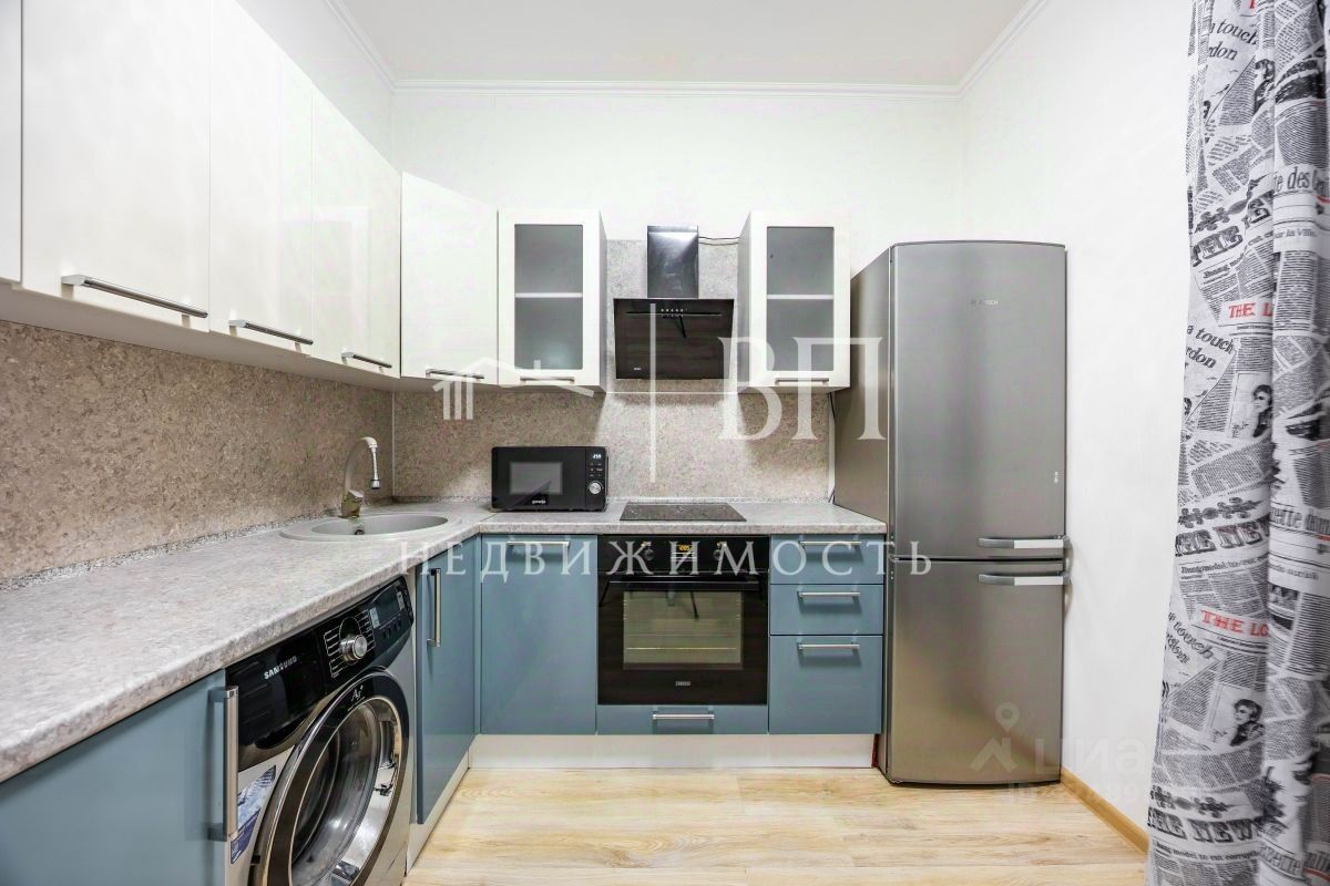 Установлен отличный кухонный гарнитур с встроенной техникой: духовой шкаф и варочная панель, холодильник, стиральная машина, микроволновка, стол, стулья,