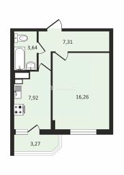 Общая площадь — 35,2 кв. м, высота потолков — 2,6 м.