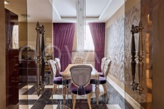 Отделка и дизайн выполнены в стиле ар-деко, который отличают четкие геометрические формы, элегантность и использование дорогих материалов. В интерьере применен натуральный камень гранит, мрамор и оникс, что подчеркивает респектабельность пентхауса.