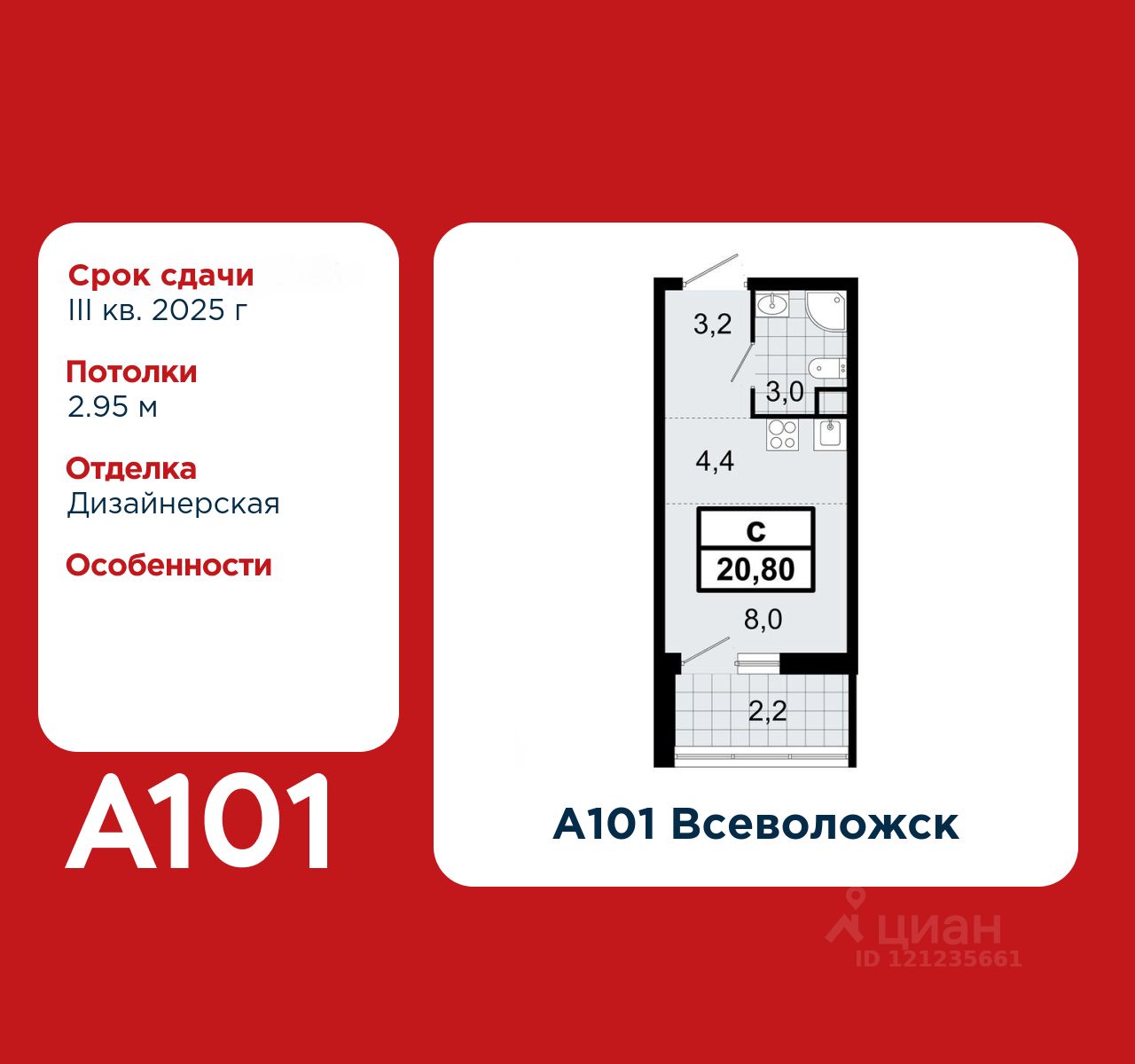 Студия площадью 20.80 в ЖК "А101 Всеволожск" c лоджией на 7 этаже. Квартира с отделкой. Вид из окна во двор. В квартире 1 санузел. Высота потолков 2.95 м.