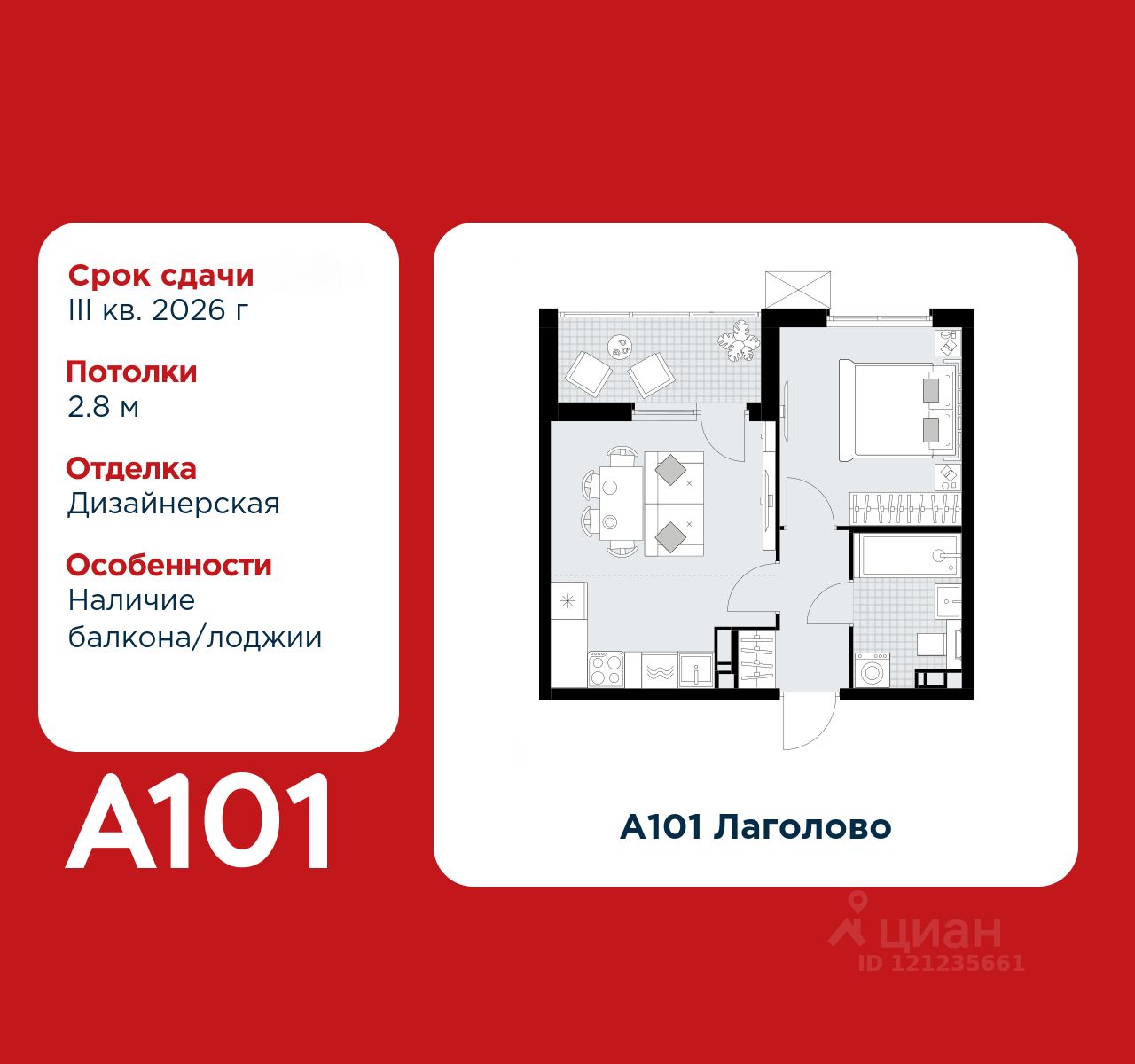 1-комнатная квартира площадью 38.00 в ЖК "А101 Лаголово" c лоджией на 12 этаже. Квартира с отделкой. Вид из окна на улицу. В квартире 1 санузел. Высота потолков 2.8 м.
