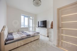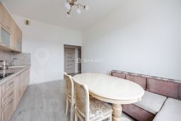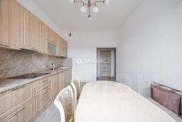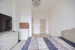 В квартире есть все необходимые удобства для комфортной жизни - кухонный гарнитур со встроенной техникой, шкафы, диван и кровати, вместительная гардеробная для хранения вещей.