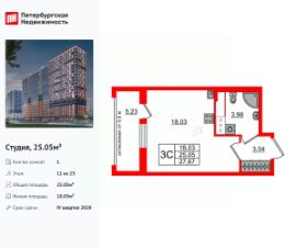Удобная, классическая, функциональная европланировка, вместительная прихожая 3.04 м². Общая площадь студии - 25.05 м², жилая 18.03 м², высота потолка 2.77 м.