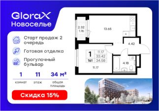 Продаётся 1-комнатная квартира в строящемся доме (Дом 6), срок сдачи: IV-кв. 2026, общей площадью 34.58 кв.м., на 11 этаже. GloraX Новоселье - новый проект комфорт-класса на юго-западной границе Санкт-Петербурга и Ленинградской области. Близость к зеленым зонам Гореловского лесопарка и природного Шунгеровского заказника, а также пешеходный многофункциональный бульвар в центре квартала - идеальное место для тех, кто ценит природу и тишину, при этом не готов отказываться от благ современной инфраструктуры.