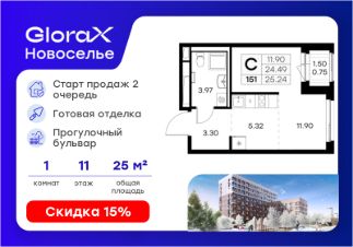 Продаётся студия в строящемся доме (Дом 5), срок сдачи: IV-кв. 2026, общей площадью 25.24 кв.м., на 11 этаже. GloraX Новоселье - новый проект комфорт-класса на юго-западной границе Санкт-Петербурга и Ленинградской области. Близость к зеленым зонам Гореловского лесопарка и природного Шунгеровского заказника, а также пешеходный многофункциональный бульвар в центре квартала - идеальное место для тех, кто ценит природу и тишину, при этом не готов отказываться от благ современной инфраструктуры.