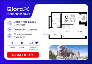 Продаётся студия в строящемся доме (Дом 5), срок сдачи: IV-кв. 2026, общей площадью 25.95 кв.м., на 11 этаже. GloraX Новоселье - новый проект комфорт-класса на юго-западной границе Санкт-Петербурга и Ленинградской области. Близость к зеленым зонам Гореловского лесопарка и природного Шунгеровского заказника, а также пешеходный многофункциональный бульвар в центре квартала - идеальное место для тех, кто ценит природу и тишину, при этом не готов отказываться от благ современной инфраструктуры.