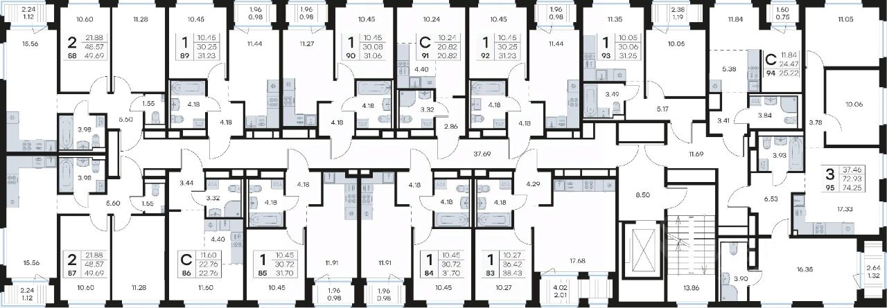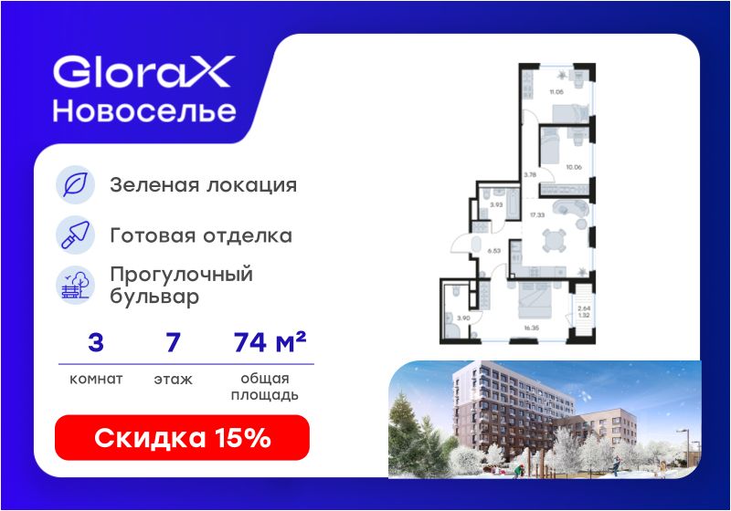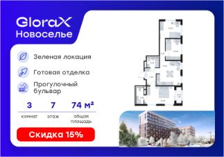 Продается 3-комн. квартира на 7-м этаже в строящемся проекте комфорт-класса GloraX Новоселье. Общая площадь лота составляет 74,25 кв. м, из которых 37,46 кв. м отведено под жилую и 17,33 кв. м под кухонную зону. Номер квартиры - 95