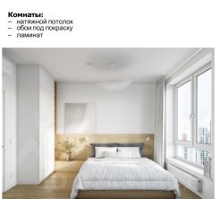 - Чистовая отделка: ламинат, обои под покраску, в ванных комнатах керамическая плитка, керамогранит и сантехника, натяжной потолок.