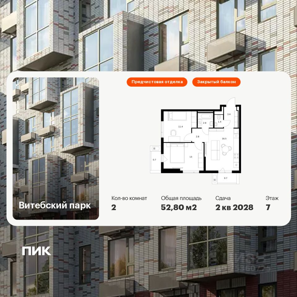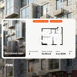 Продаётся 2-комн. квартира площадью 52,8 кв.м на 7 этаже 12 этажного дома (Корпус 6, Секция 1) проекта ПИК Витебский парк. Светлый просторный подъезд на уровне земли, функциональная планировка, большие окна, предчистовая отделка.