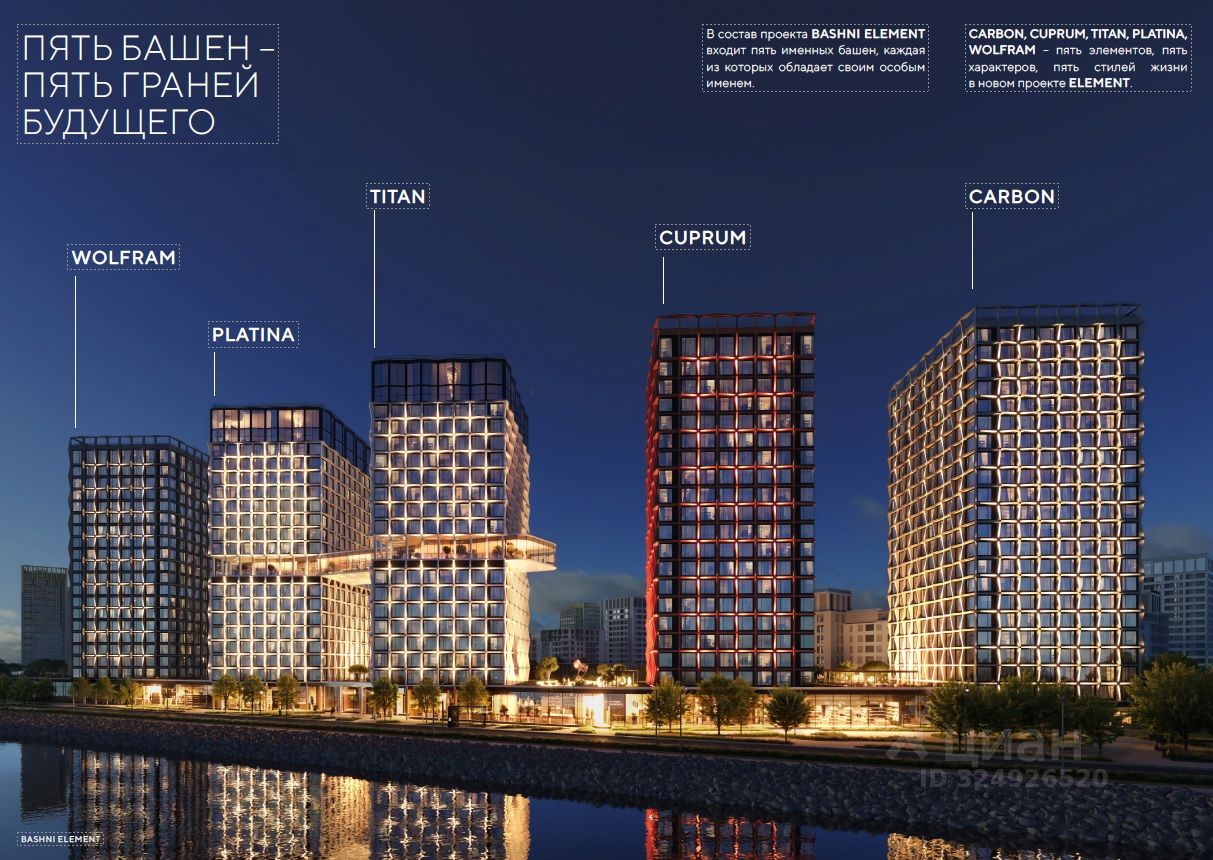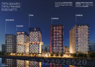 Футуристичная архитектура от А.Лен 5 разновысотных башен: САRВОN, СUРRUМ, ТIТАN, РLАТINА и WОLFRАМ (от 18 до 22 этажей)