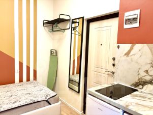 Апартаменты-студия расположены в апарт-отеле, который представляет собой отдельно стоящее 4-этажное здание, ухоженное и чистое, сделан капитальный ремонт с полной заменой всех коммуникаций. На лестницах и холлах сделан качественный красивый ремонт. Здание находится в тихом зеленом дворе, вдали от шумной улицы.