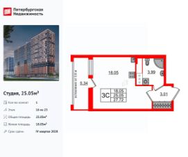Удобная, классическая, функциональная европланировка, вместительная прихожая 3.01 м². Общая площадь студии - 25.05 м², жилая 18.05 м², высота потолка 2.77 м.