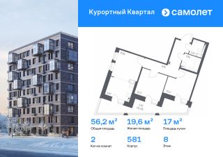Строим кварталы для жизни с заботой о будущем. Предлагается 2-комнатная квартира комфорт-класса 56,2 кв.м в корпусе 581 на 8 этаже, в ЖК "Курортный Квартал"