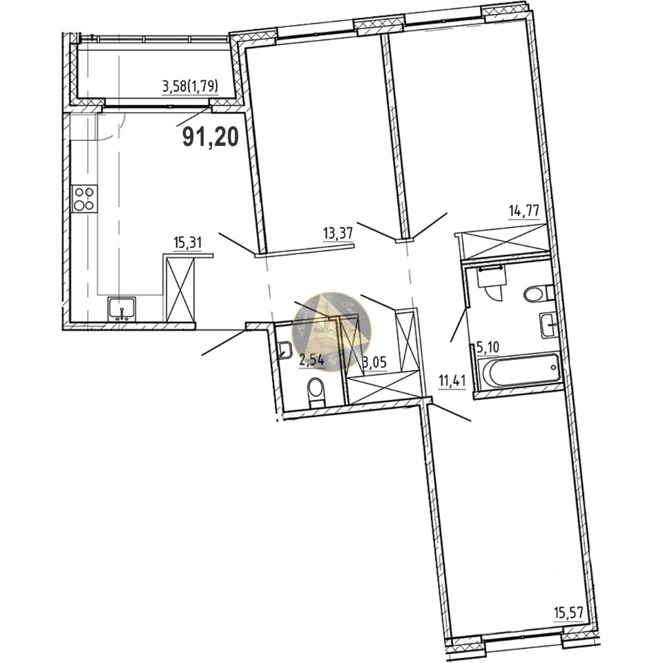 Квартира находится на 4/9 этаже. Общая площадь квартиры 91.20 м2.