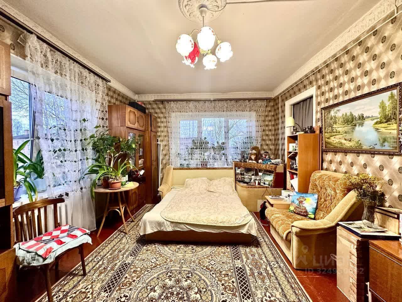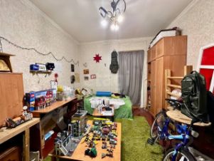 Трехкомнатная квартира площадью 86,6 м² расположена в кирпичном доме сталинской постройки в центре поселка.