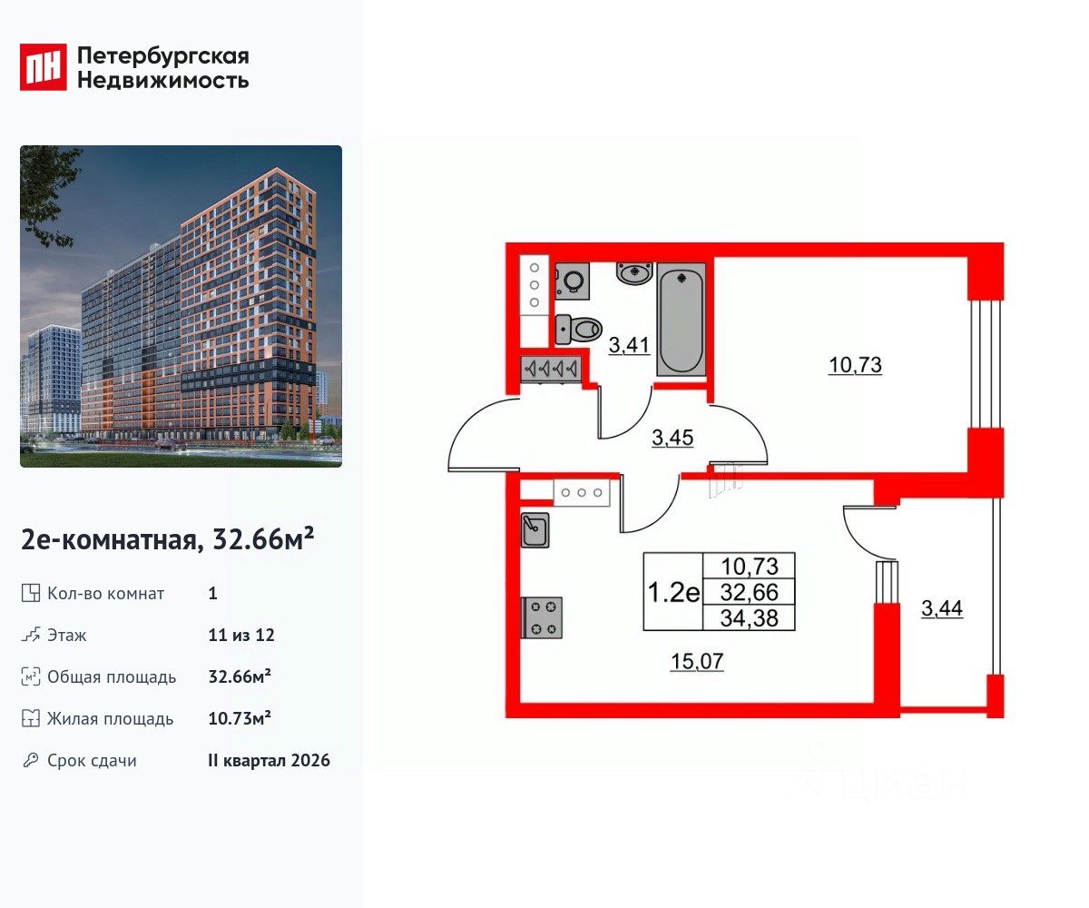 Удобная, классическая, функциональная европланировка, большая кухня-гостиная 15.07 м², вместительная прихожая 3.45 м². Общая площадь квартиры - 32.66 м², жилая 10.73 м², высота потолка 2.77 м.