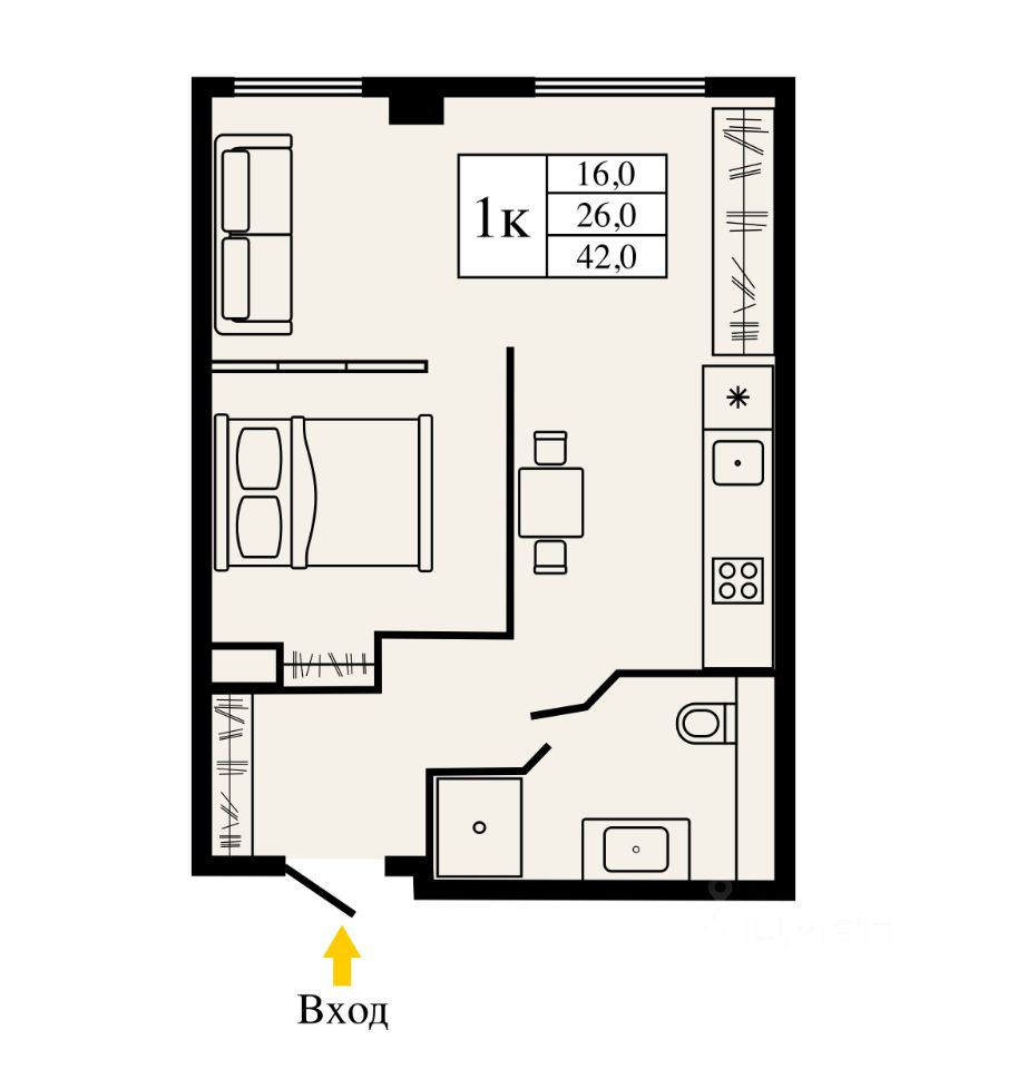 * Жилая комната - 16 кв.м., с изолированной спальной зоной, за стеклянной перегородкой, и гостевой зоной с мягким диваном. Также предусмотрена рабочая зона у окна.
