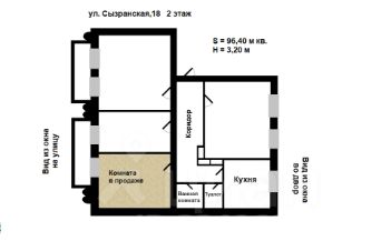 Комната граничит с ванной, что позволяет создать уютную двухэтажную студию при желании. Высота потолка позволяет это сделать. Окно выходит на улицу Сызранскую, наполняя пространство естественным светом и уютом.