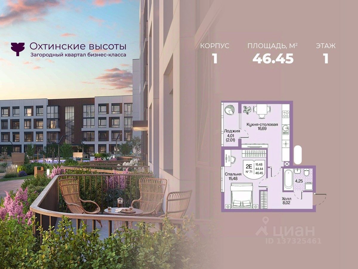 Загородный квартал бизнес-класса "Охтинские высоты" - это ваш новый образ жизни, в котором сбалансированы преимущества проживания на природе в сочетании с городскими сервисами. Квартал расположен рядом со всесезонным курортом Охта Парк, всего в 10 минутах от КАДа. В окружении расположены премиальные конные клубы, теннисные корты, банное пространство "Камыши". Также к услугам жителей легендарный лесной каток, теплый бассейн на открытом воздухе, SPA, рестораны и энотека Охта Парка, куда от квартала будет запущен шаттл только для жителей "Охтинских высот". Вокруг квартал рекреационная лесная зона невероятной красоты, буквально кислородная фабрика 24/7. Ко въезду ведет новая автомобильная дорога, специально построенная для комфорта будущих жителей "Охтинских высот". В первой очереди квартала уже реализуется детский сад на 120 мест. Запроектированы коммерческие помещения под аптеку, супермаркет, пункты выдачи заказов, кофейни и велнесс. Территория квартала безбарьерная. В каждом дворе будет выполнено уникальное благоустройство по авторскому проекту с детскими и спортивными площадками, местами для отдыха и активностей. Концепция озеленения выстроена по принципу "живописный двор круглый год". Любителям активного образа жизни особенно понравятся эксплуатируемые кровли с зонами для йоги и солярия, откуда открывается невероятный вид на зеленый лес, раскинувшийся вокруг квартала. Дворы закрытые, без машин. Безопасность жителей обеспечивает система круглосуточного наблюдения и охрана. Входные группы светопрозрачные, с увеличенными окнами "от колена". Вход с уровня земли. Жители всегда видят, что происходит во дворе и в парадной. МОПы отделами качественными материалами с фактурой дерева и камня. В каждой парадной современные грузопассажирские лифты, отдельно выделены колясочные и велосипедные. Квартал малоэтажный, всего 4 этажа. Высота потолков при этом от 3 м и выше. Квартиры спроектированы таким образом, чтобы закрыть потребности в ежедневном комфортном проживании для семей любого состава. В квартирах: • Живописные патио на первых этажах • Зоны для организации хранения • Мастер-спальни • Комнаты правильной формы • Просторные кухни-гостиные с комфортным зонированием • Гардеробные • Дополнительные санузлы • Увеличенные окна 2х2 м • Система управления комфортом в каждой квартире ("Умный дом") • Подготовка под установку кондиционера • Балконы и лоджии Все квартиры сдаются с отделкой white-box и Системой управления комфортом (умный дом). На выбор можно заказать чистовую отделку, которая представлена в двух вариантах.