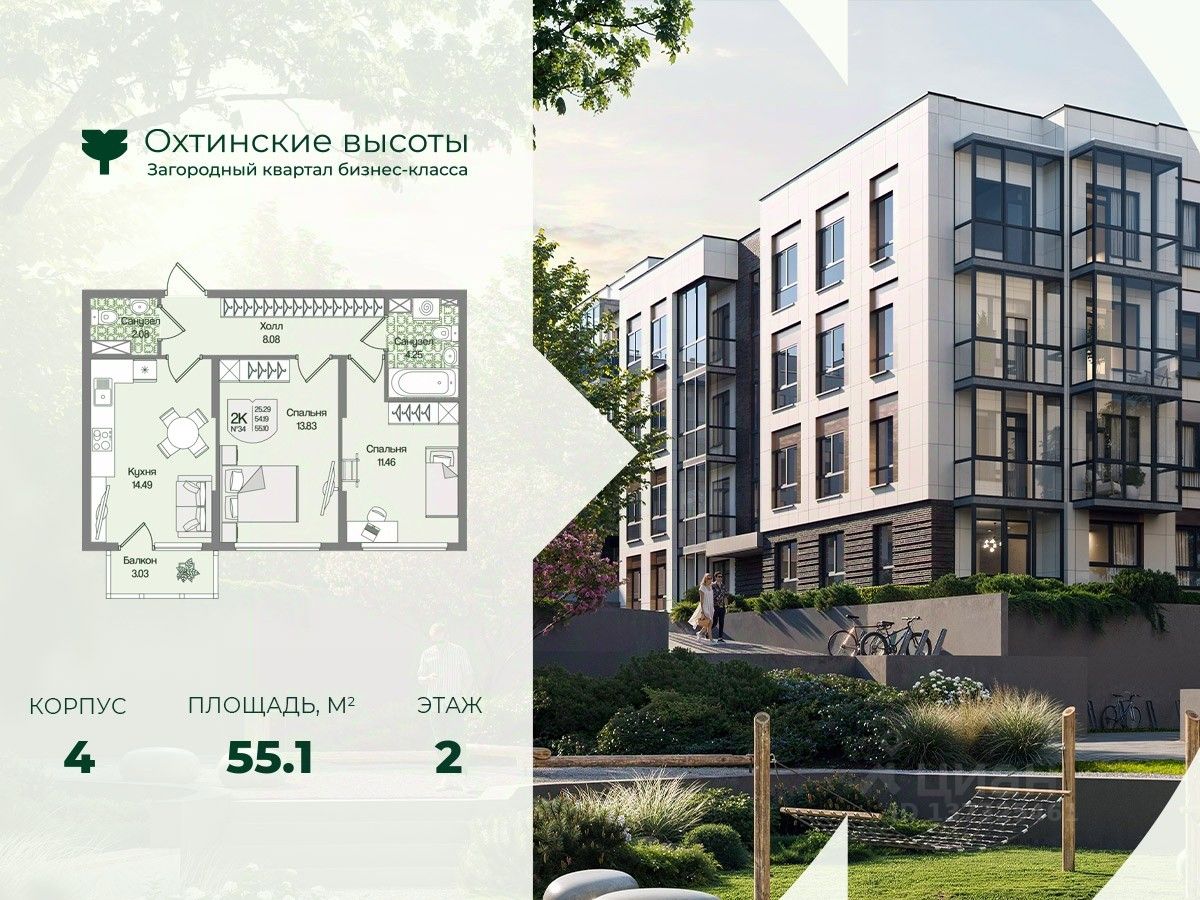 Загородный квартал бизнес-класса "Охтинские высоты" - это ваш новый образ жизни, в котором сбалансированы преимущества проживания на природе в сочетании с городскими сервисами. Квартал расположен рядом со всесезонным курортом Охта Парк, всего в 10 минутах от КАДа. В окружении расположены премиальные конные клубы, теннисные корты, банное пространство "Камыши". Также к услугам жителей легендарный лесной каток, теплый бассейн на открытом воздухе, SPA, рестораны и энотека Охта Парка, куда от квартала будет запущен шаттл только для жителей "Охтинских высот". Вокруг квартал рекреационная лесная зона невероятной красоты, буквально кислородная фабрика 24/7. Ко въезду ведет новая автомобильная дорога, специально построенная для комфорта будущих жителей "Охтинских высот". В первой очереди квартала уже реализуется детский сад на 120 мест. Запроектированы коммерческие помещения под аптеку, супермаркет, пункты выдачи заказов, кофейни и велнесс. Территория квартала безбарьерная. В каждом дворе будет выполнено уникальное благоустройство по авторскому проекту с детскими и спортивными площадками, местами для отдыха и активностей. Концепция озеленения выстроена по принципу "живописный двор круглый год". Любителям активного образа жизни особенно понравятся эксплуатируемые кровли с зонами для йоги и солярия, откуда открывается невероятный вид на зеленый лес, раскинувшийся вокруг квартала. Дворы закрытые, без машин. Безопасность жителей обеспечивает система круглосуточного наблюдения и охрана. Входные группы светопрозрачные, с увеличенными окнами "от колена". Вход с уровня земли. Жители всегда видят, что происходит во дворе и в парадной. МОПы отделами качественными материалами с фактурой дерева и камня. В каждой парадной современные грузопассажирские лифты, отдельно выделены колясочные и велосипедные. Квартал малоэтажный, всего 4 этажа. Высота потолков при этом от 3 м и выше. Квартиры спроектированы таким образом, чтобы закрыть потребности в ежедневном комфортном проживании для семей любого состава. В квартирах: • Живописные патио на первых этажах • Зоны для организации хранения • Мастер-спальни • Комнаты правильной формы • Просторные кухни-гостиные с комфортным зонированием • Гардеробные • Дополнительные санузлы • Увеличенные окна 2х2 м • Система управления комфортом в каждой квартире ("Умный дом") • Подготовка под установку кондиционера • Балконы и лоджии Все квартиры сдаются с отделкой white-box и Системой управления комфортом (умный дом). На выбор можно заказать чистовую отделку, которая представлена в двух вариантах.