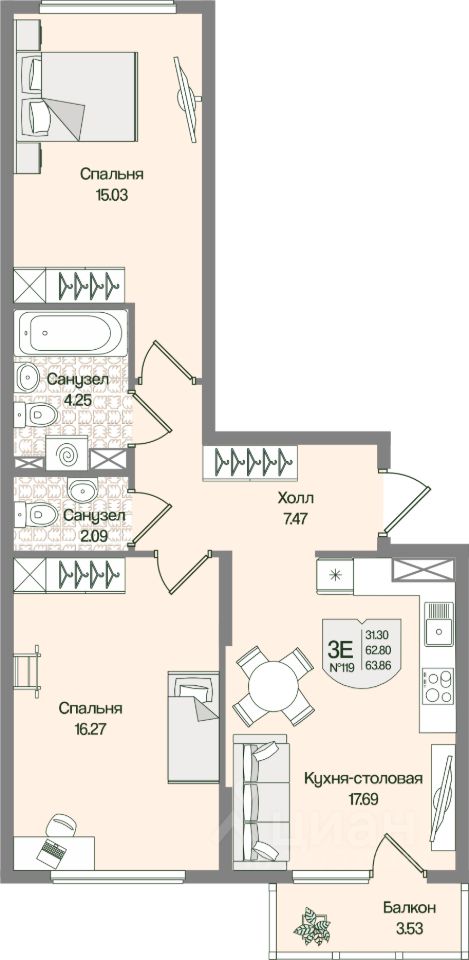 Общая площадь63,86 м²