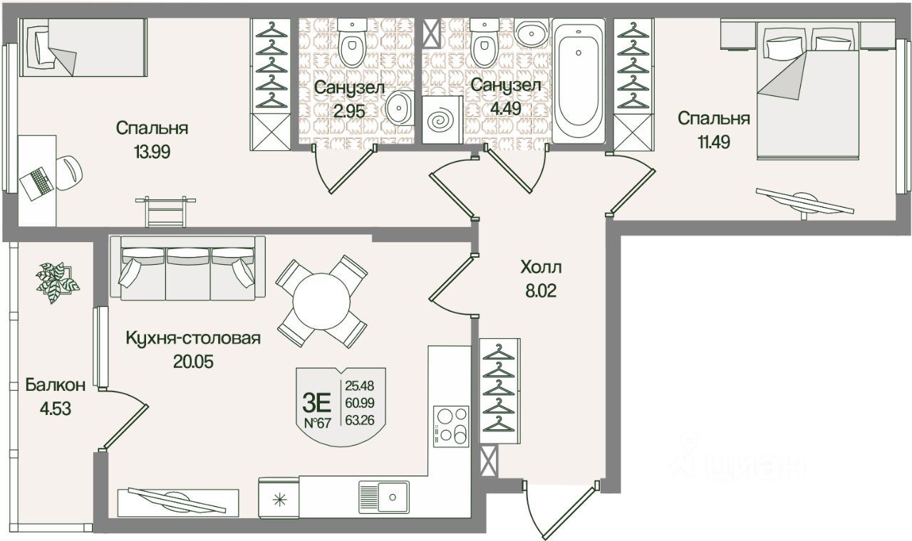 Общая площадь63,25 м²