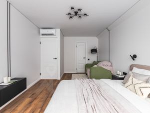 В комнате большая ТВ тумба, удобная двухспальная кровать, спальное место (160*200 см), полноценное рабочее место, раскладной диванчик. Из комнаты вход в гардеробную.