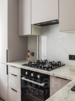 Кухня оснащена большим кухонным гарнитуром с встроенной бытовой техникой. Техника новая, на гарантии. Здесь много рабочих зон для готовки, организованна удобная обеденная зона с круглым столом и комфортными стульями.
