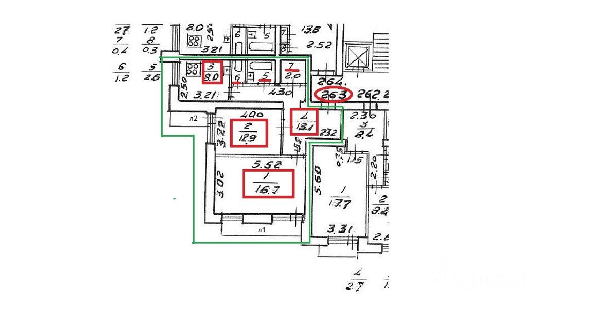 Контур квартиры выделен зелёным цветом, к жилым комнатам примыкают лоджии.