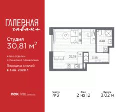 Продается 1-комн. квартира-студия в ЖК "Галерная гавань" на 2 этаже. Квартира без отделки, новый собственник может сделать ремонт по своему проекту. Общая площадь: 30.81 кв.м., площадь гостиной 22.38 кв.м., из которых 5 кв.м. выделено под кухонную зону. Все окна выходят на одну сторону. В квартире один совмещенный санузел. Высота потолков 3.02 м.