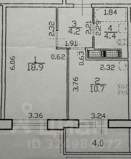 Кухня 10,7 м.кв., комната изолированная 18,9 м.кв., совмещенный санузел 4,4 м.кв., коридор 4,2 м.кв.