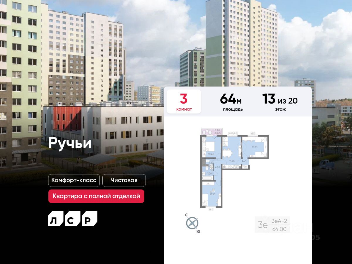 Продаётся 3-комнатная квартира в ЖК "Ручьи" на 13 этаже. Общая площадь составляет 64.00 кв. м. Квартира с чистовой отделкой. Жилой комплекс "Ручьи" располагается по адресу Санкт-Петербург, Красногвардейский.