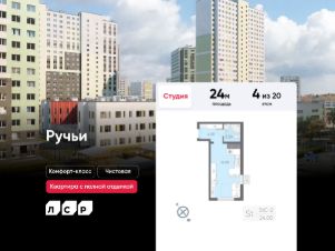 Продаётся студия в ЖК "Ручьи" на 4 этаже. Общая площадь составляет 24.00 кв. м. Квартира с чистовой отделкой. Жилой комплекс "Ручьи" располагается по адресу Санкт-Петербург, Красногвардейский.