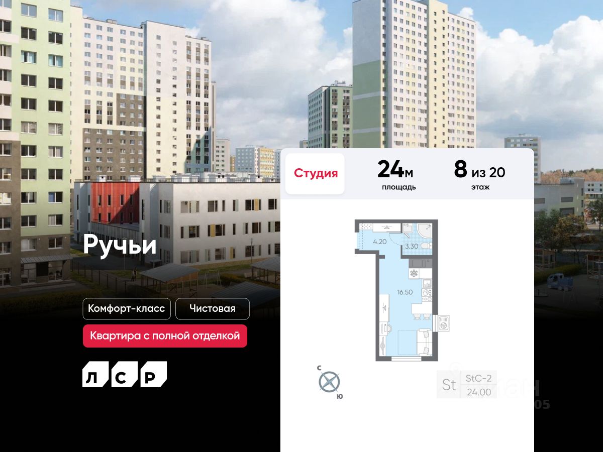 Продаётся студия в ЖК "Ручьи" на 8 этаже. Общая площадь составляет 24.00 кв. м. Квартира с чистовой отделкой. Жилой комплекс "Ручьи" располагается по адресу Санкт-Петербург, Красногвардейский.