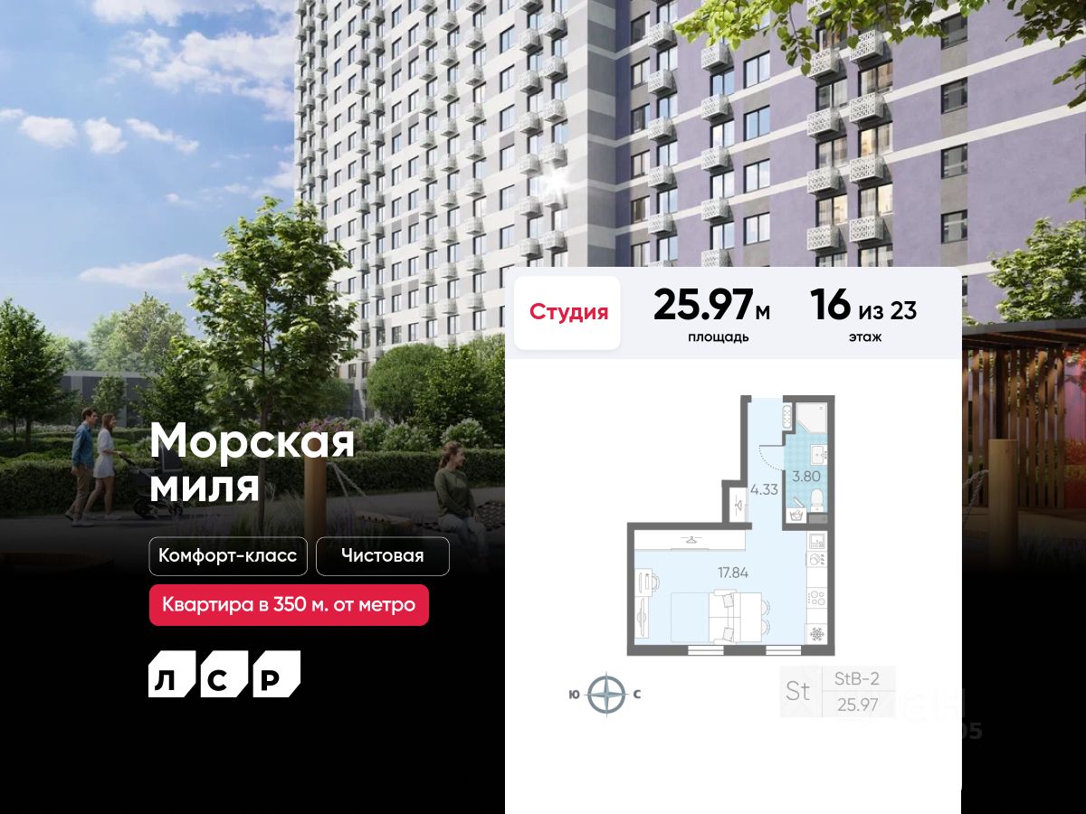 Продается студия в ЖК "Морская миля" на 16 этаже. Общая площадь составляет 25.97 кв. м. Квартира с чистовой отделкой. Жилой комплекс "Морская миля" располагается по адресу Санкт-Петербург, Красносельский.