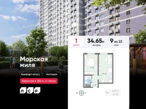 Продается 1-комнатная квартира в ЖК "Морская миля" на 9 этаже. Общая площадь составляет 34.65 кв. м. Квартира с чистовой отделкой. Жилой комплекс "Морская миля" располагается по адресу Санкт-Петербург, Красносельский.